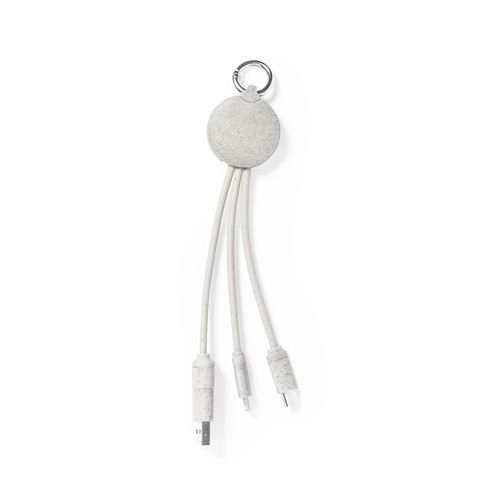 Câble de charge avec anneau en canne de blé, favorisant ainsi l'utilisation de matières premières naturelles et réduisant les émissions polluantes. Comprend des connexions d'entrée Type-C et USB des sorties Lightning, Micro USB et USB. Présenté dans un sac individuel de conception kraft.