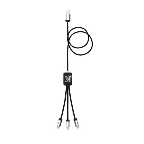 Câble d'un mètre avec double logo lumineux recto/verso pour type C, iPhone et Android et cordons en rPET (plastique issus de bouteilles recyclées). Finition métal, rubber soft touch sur l'import / ABS satiné sur le stock.