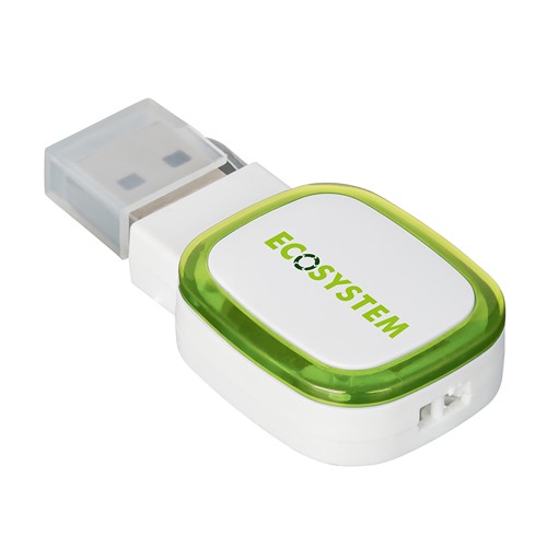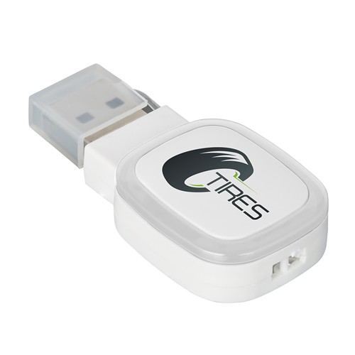 Cette clé USB avec port USB 2.0 est sur stock avec une capacité de mémoire de 4, 8 ou 16 Go. Capacités plus élevées à la demande. La bague de couleur sur l‘espace publicitaire s‘allume via LED.