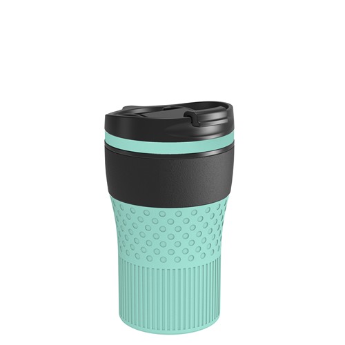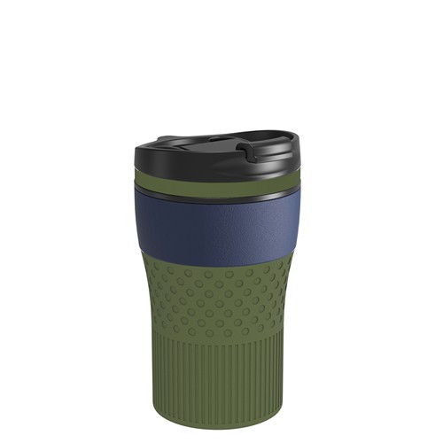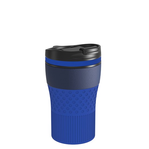 Le corps est proposé avec un revêtement en poudre mat en bleu marine, noir ou blanc, ou en version acier inoxydable avec finition anti-traces. Le mug, le couvercle et les pièces en silicone passent au lave-vaisselle. La personnalisation est possible par gravure au laser, par tampographie de 1 à 2 couleurs ou par impression UV.