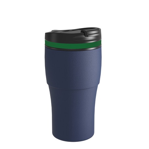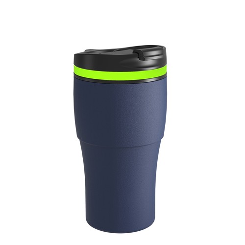 Le corps est disponible avec un revêtement en poudre mat en bleu marine, noir ou blanc, ou en acier inoxydable avec finition anti-traces. Le mug, le couvercle et les éléments en silicone passent au lave-vaisselle. La personnalisation est possible par gravure au laser, par tampographie de 1 à 2 couleurs ou par impression UV.