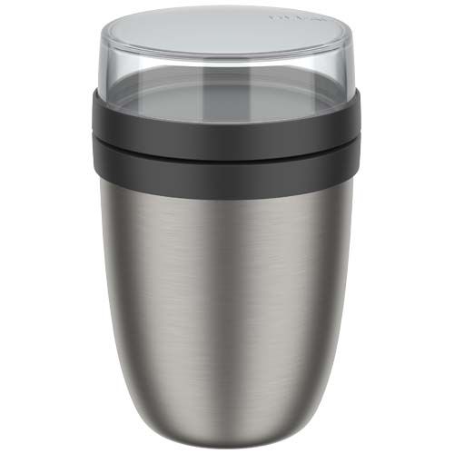 Infuseur à thé en acier inoxydable en forme de sachet de thé avec coupelle et poignée en silicone.