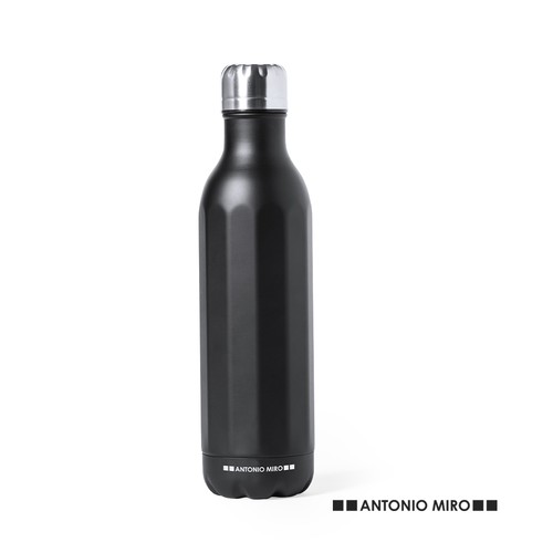 Bouteille en acier inoxydable dAntonio Miró. Avec une capacité de 750ml et une finition sobre en noir satiné, avec un corps en forme de prisme et le logo de la marque sur la base. Avec bouchon à vis chromé et présenté dans une boîte design attrayante avec le logo de la marque.