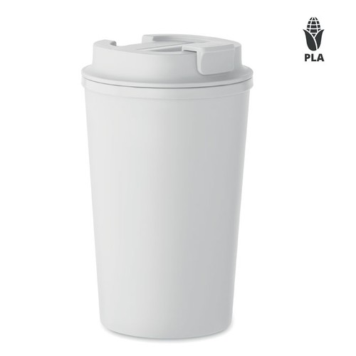 Gobelet double paroi en maïs 100% PLA avec couvercle en PP et intérieur en TPR. Anti fuite. Capacité : 350 ml.