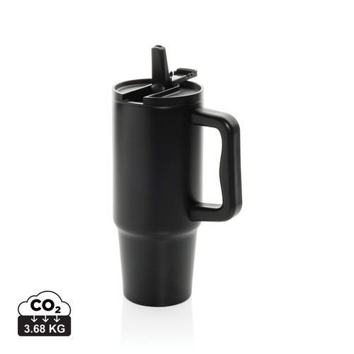Mug à double paroi en acier inoxydable recyclé (90 % d'acier inoxydable recyclé et 10 % d'acier inoxydable) avec poignée en bois. Capacité : 350 ml.