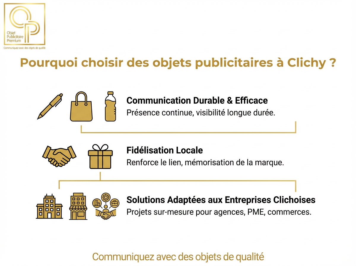 Valorisez votre image grâce à des objets publicitaires à Clichy conçus pour renforcer votre notoriété, fidéliser vos clients et faire rayonner votre entreprise dans le nord parisien. Spécialistes de la communication par l’objet, nous proposons une large sélection de goodies à Clichy, de cadeaux d’entreprise et d’articles promotionnels adaptés à vos actions locales. Du design à la personnalisation de vos objets personnalisés à Clichy, nos équipes créent des supports uniques, responsables et pensés pour refléter votre univers. PME, agences, commerces ou grandes enseignes du 92 bénéficient ainsi d’une logistique optimisée et d’une livraison rapide à Clichy et dans les Hauts-de-Seine. Contactez-nous pour un devis gratuit et sans engagement.