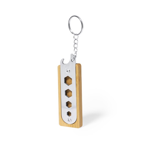 Porte-clés multifonctions fabriqué en acier inoxydable résistant et en bambou. Il comprend un ensemble pratique de 4 clés hexagonales fixes troquées et un ouvre-bouteille. Présenté dans une boîte individuelle au design kraft.