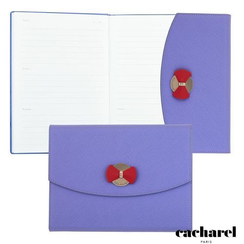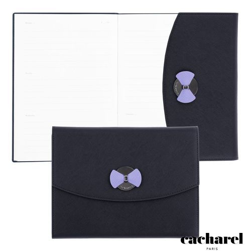 L'agenda Happiness Hortense est réalisé dans une matière grainée Saffiano et est décoré d'une jolie plaque métallique gravée Cacharel avec un noeud de couleur contrastée. Il est non daté et est orienté développement personnel avec sa partie prise de note pour ses objectifs et ses accomplissements de la semaine. Cet agenda est disponible en bleu lilas et bleu marine. Idéal pour une année positive et organisée.