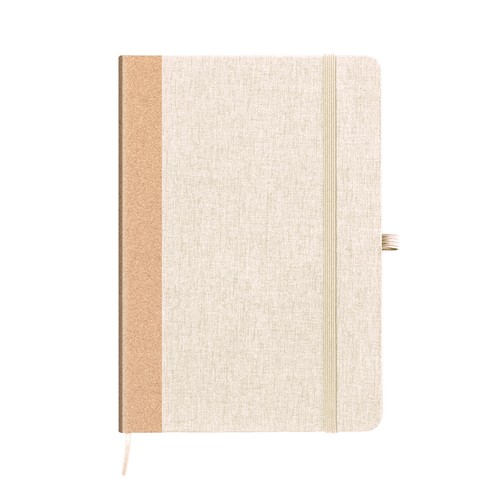 Carnet A5 avec couverture en liège rigide et colorée. Reliure dos collé. 192 feuilles lignées (96 feuilles). Fermeture élastique, marque page en ruban et porte-stylo élastique.