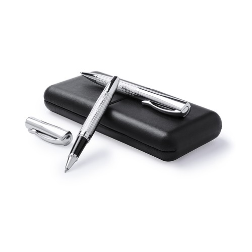 Parure élégante, stylo à bille avec mécanisme de rotation et capuchon au design sobre. Corps en métal antidérapant en finition argent brillant avec clip de couleur assortie. Présenté dans un étui en cuir PU noir individuel élégant et original avec un intérieur en velours blanc doux découpé à l emporte-pièce. Cartouche Jumbo avec encre bleue de qualité allemande.
