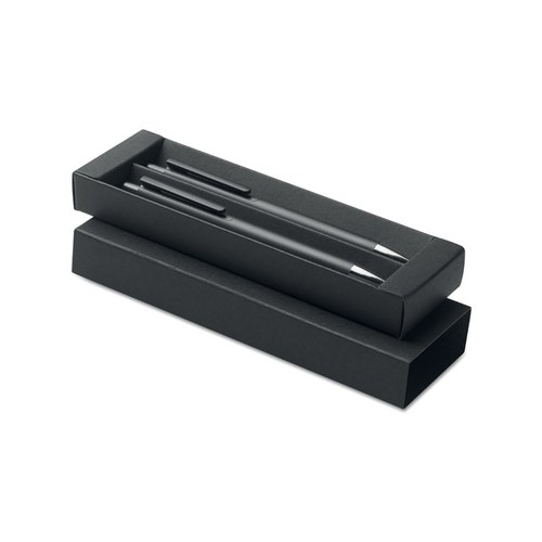 Parure de stylos en aluminium recyclé comprenant 1 stylo bille à poussoir (encre bleue) et 1 stylo graphite sans encre. Présentée dans une boîte en papier recyclé.