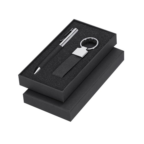 Élégant set en RPET avec finition noire bicolore et détails métalliques. Inclut:- Stylo en RPET avec finition noire bicolore et détails métalliques. Avec mécanisme rotatif et encre bleue.- Porte-clés en RPET avec finition noire bicolore et accessoires chromés.Présenté dans une boîte individuelle noire. Inclut une carte noire intérieure avec marquage RPET.Le matériau RPET est fabriqué à partir de plastique recyclé, pour ainsi favoriser la réutilisation des déchets plastiques et aider à la durabilité de la planète.