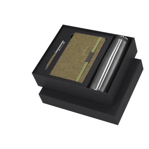 Set de bloc-notes et stylo confectionnés avec Fibres de Thé, ainsi qu'une gourde thermique fabriquée en acier inox.Le set comprend :- Bloc-notes à couvertures rigides, avec 80 pages à lignes, bande élastique avec clip métallique et marque-page assorti. - Stylo en aluminium avec finition chrome et prise en Fibres de Thé, mécanisme rotatif et encre bleue. - Gourde thermique à double paroi fabriquée en acier inox de 500 ml. Avec bouchon à vis et anse métallique. Bloc avec logo Tea Grounds marqué au dos. Présenté de manière élégante dans une boîte noire avec intérieur découpé. Tea Grounds est un matériau durable créé à partir de déchets de feuilles de thé recyclées. Lors du traitement du thé, les résidus sont collectés et compactés pour leur donner une seconde vie en tant que ressource utile. Sa production favorise l'économie circulaire et réduit l'impact environnemental.