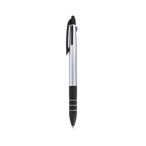 Stylo stylet 3 en 1 avec mécanisme à bouton poussoir rétractable. Ligne actuelle avec corps finition métallisé dans des couleurs vives. Attributs noirs et grip ergonomique noir avec anneaux assortis. 3 cartouches d´encre : bleue, rouge et noire.
