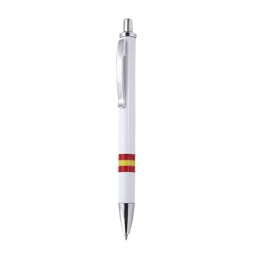 Stylo à mécanisme poussoir, élégant design bicolore avec accessoires en couleur argentée brillante et corps doux finition blanc brillant avec drapeau national espagnol. Avec clip métallique, cartouche jumbo et encre bleue.