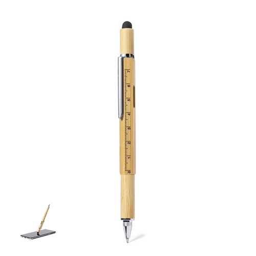 Stylo multifonction de la ligne Nature en bambou. Avec un mécanisme rotatif et à l'encre bleue, avec un clip en métal et des accessoires chromés. Fonctions stylet, pointeur tactile, tournevis plat et cruciforme niveau et règle.