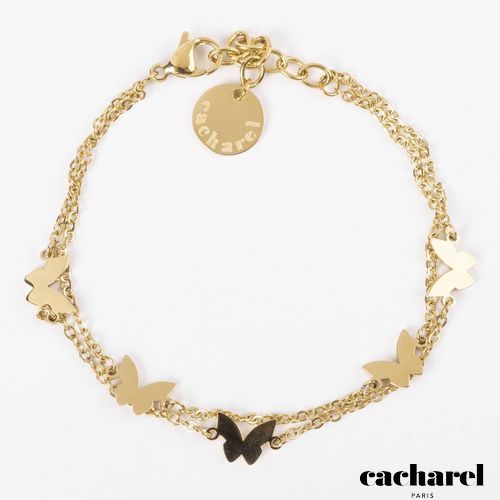 Le bracelet Albane est une double rangée de chaînes raffinées, rehaussées du papillon signature de Cacharel. Le résultat est un accessoire au toucher féminin et tendance, parfait pour être mélangé et assorti à toute la collection pour créer des ensembles. Ce bracelet est fabriqué en acier inoxydable.