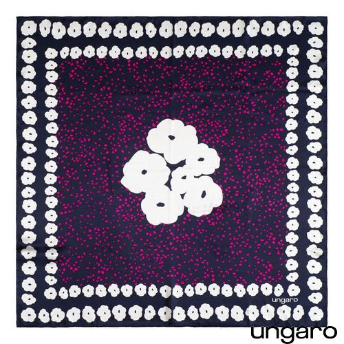 Le foulard "Giada" 100% soie avec son imprimé bleu foncé, fushia et fleurs blanches est frais et féminin. Poids : 41 g - Dimensions : 900 x 900 mm. Livré dans son élégante pochette noire Ungaro.